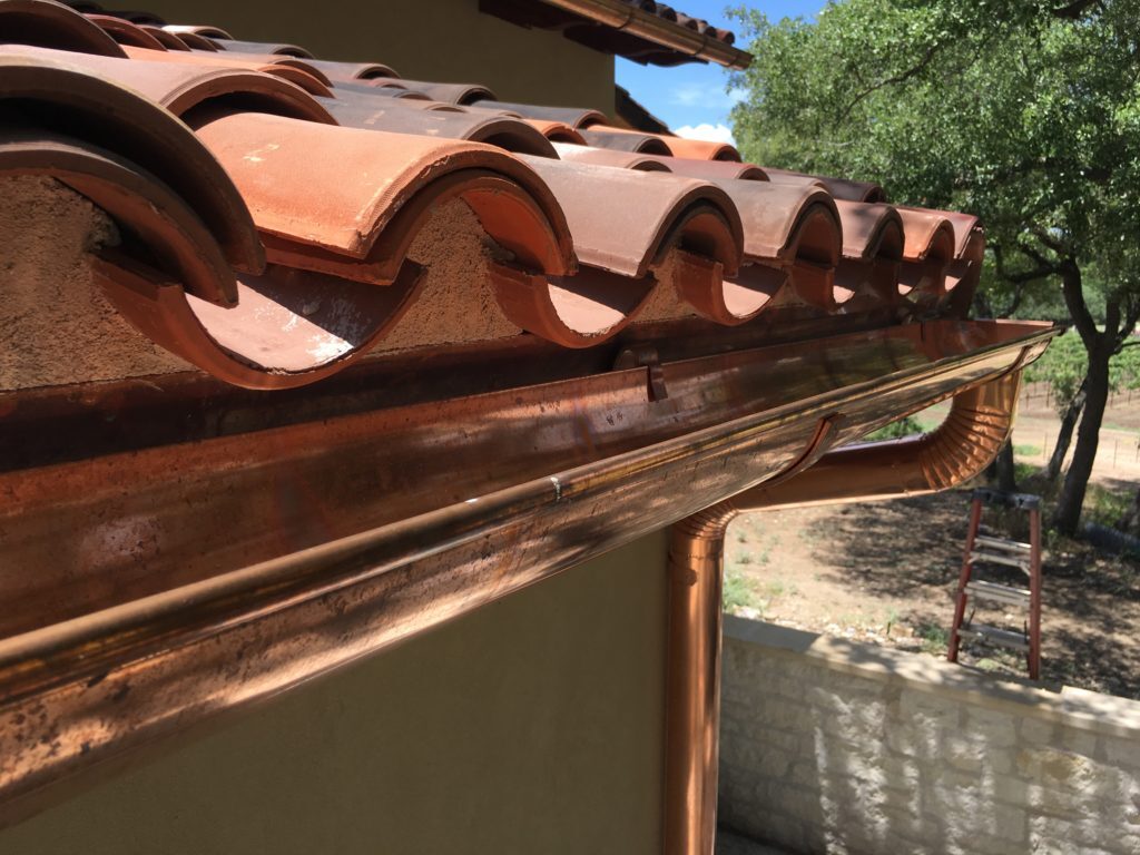 -Genuine, pure copper throughout - all the way down to the hanger clips, copper mesh leaf guards, and 4” round downspouts.