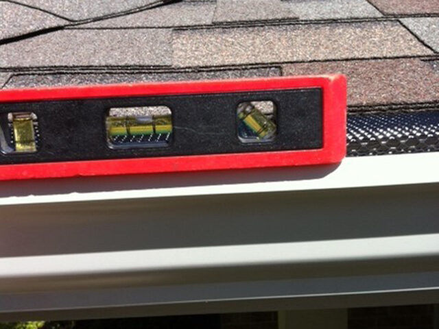 Our gutters are always pitched toward the downspouts, using a level in order to maintain proper fall. This insures little or no standing water in the gutter. A gutter installed level will drain because water levels itself, however you will not have any water flow to self-clean the gutter, and could potentially attract pesky insects, such as mosquitoes.