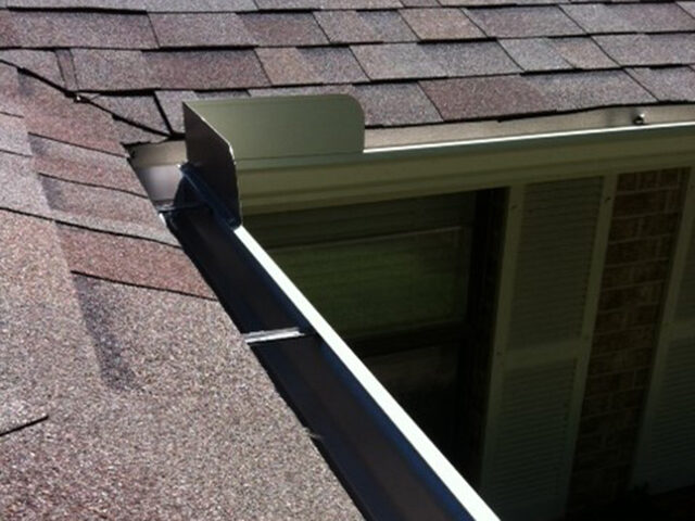 As with any gutter system we install, a splash guard is our standard, in order to prevent water from overshooting the gutters. The amount of water that flows from a roof valley into a gutter is much greater than the amount of water that flows into the gutter from other sections of the roof. These deflectors are installed on inside corners, or anywhere two roof lines meet to form a valley.