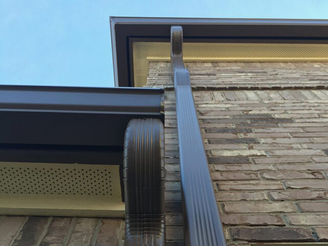 Providing a clean and simplistic/custom look, this is THE most versatile gutter you can have. If you want gutters that don’t look like gutters, then straight face, aka angle face gutters are the perfect choice for you. Also known as “invisible gutters”, these are flat (or straight) on the front side and virtually disappear into the roofline. All miters and end caps must be hand-cut by our skilled craftsmen. Available in both 5” and 6” sizes.